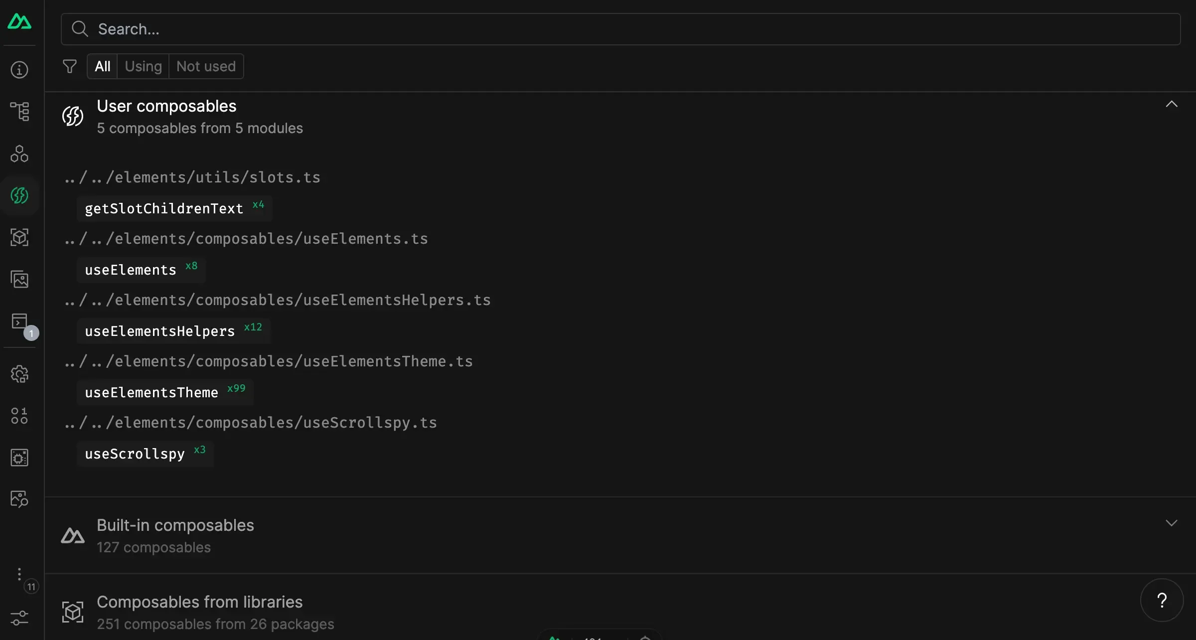 Disover all the auto-imports composables and utils registered in your app. You can see which files are importing them, and where they are from. Some entries can also provide short descriptions and documentation links.